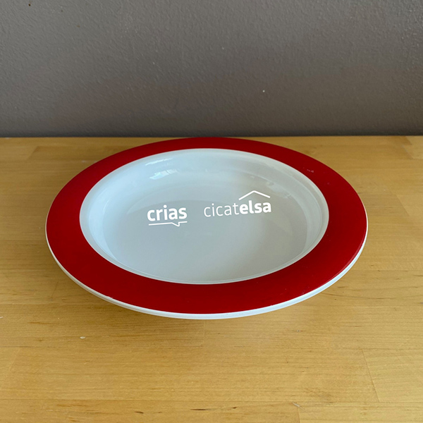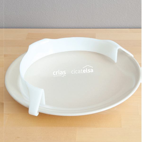 Elle dispose d’un rebord haut incurvé et d’un rebord plat permettant de manger d’une seule main sans faire déborder les aliments. Il existe différents modèles d’assiette avec des rebords plus ou moins importants. Certaines d’entre elles passent au micro-onde et au lave-vaisselle.
