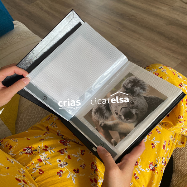 C’est un album photo dont chaque page dispose d’un système permettant d’enregistrer un message vocal en lien avec une image ou une photo. Le message peut ensuite se lire simplement en appuyant sur le bouton associé à chaque emplacement. Pour supprimer le message enregistré il faut réenregistrer un message par-dessus. Les images ne sont pas vendues avec le cahier. Il se compose de 20 pages avec deux espaces photos par page. Il fonction avec 3 piles non fournies. Les dimensions des pochettes photos sont de 13.5 x 18 cm. Il existe deux versions au choix : la version standard (18 s/page) et premium (10 mm/pages + prise micro USB).