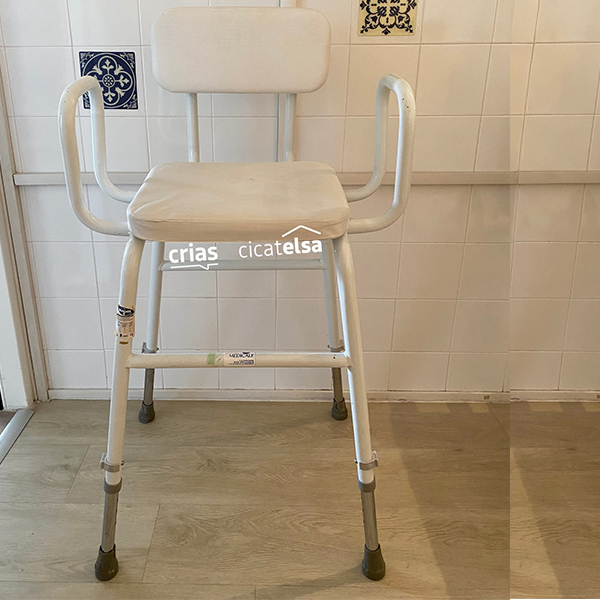 Elle permet de préparer le repas, faire du repassage ou toute autre activité du quotidien en étant installé sur une assise haute. L’assise, légèrement inclinée vers l’avant, facilite les transferts. Les pieds sont antidérapants et réglables en hauteur entre 52 et 67 cm. Cette chaise pèse 5.3kg. Elle supporte un poids maximal de 172 kg et est de dimensions : L 58 x prof 41 cm. Dimensions de l’assise : L 36 x prof 29 cm.