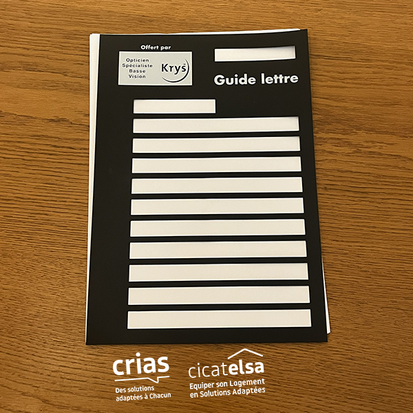 Accessoire en carton avec fentes horizontales dans lequel il est possible de glisser une feuille A4 pour permettre une écriture droite. Le carton noir offre un contraste permettant un repérage visuel plus aisé.