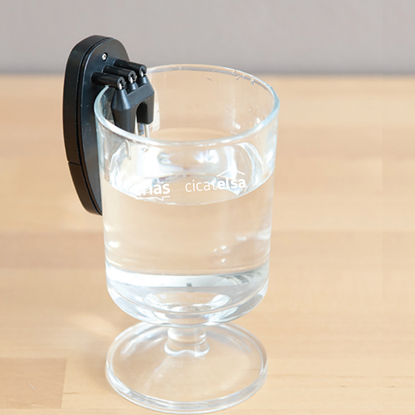Le criquet est un boitier muni d’électrodes à placer à cheval sur le rebord d’un verre ou de tout autre contenant. Un signal sonore est émis au moment où le liquide atteint les électrodes. Ce signal est amplifié lorsque le liquide atteint le capteur du milieu pour avertir que le niveau limite est presque atteint.